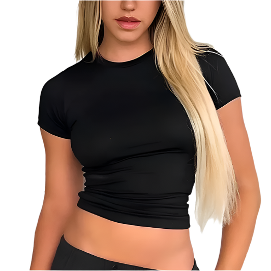 Camiseta de manga corta ajustada para mujer, estilo cuello redondo