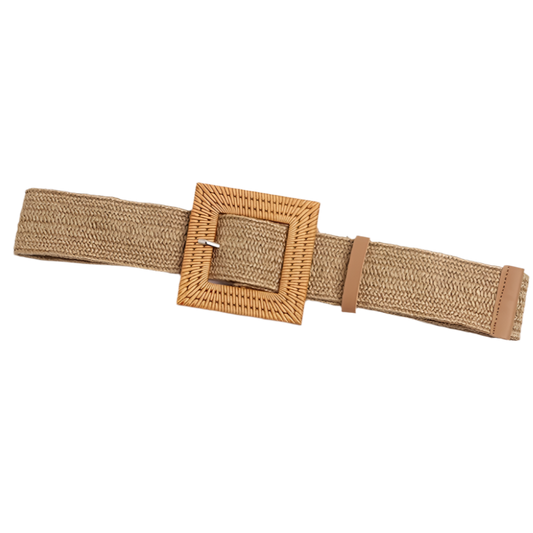 Cinturón Elástico para Mujer con Hebilla Cuadrada de Tejido de Paja de Colores Beige y Negro