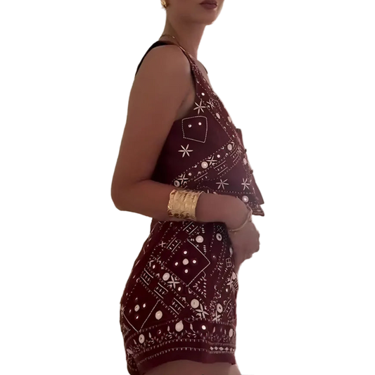 Boho Chic Outfit Set of Red Embroidered Sleeveless Vest and Wide Leg Shorts